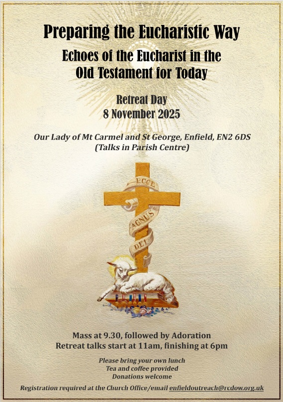 Theme ‘Preparing the Eucharistic Way: Echoes of the Eucharist in the Old Testament for Today’. The day will start with Mass at 9.30am, followed by Adoration in the Church. The retreat talks start at 11am, finishing at 6pm (in the Parish Centre). Please bring your own lunch. Tea and coffee will be provided. Donations welcome. Please register by emailing or pop in at the Presbytery.