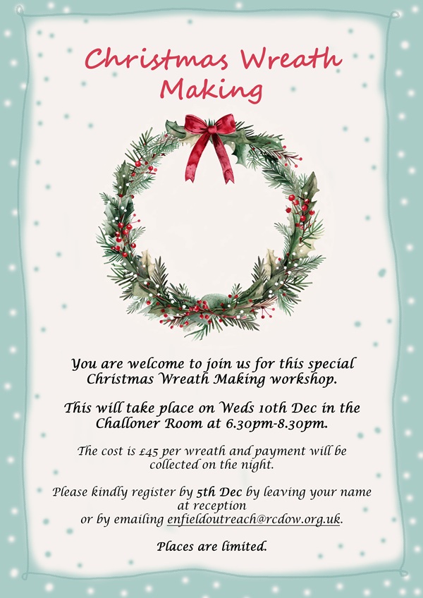 You are welcome to join us for this special Christmas Wreath Making workshop. This will take place on Weds 10th Dec in the Challoner Room at 6.30pm-8.30pm. The cost is £45 per wreath and payment will be collected on the night. Please kindly register by 5th Dec by leaving your name at reception or by emailing . Places are limited.